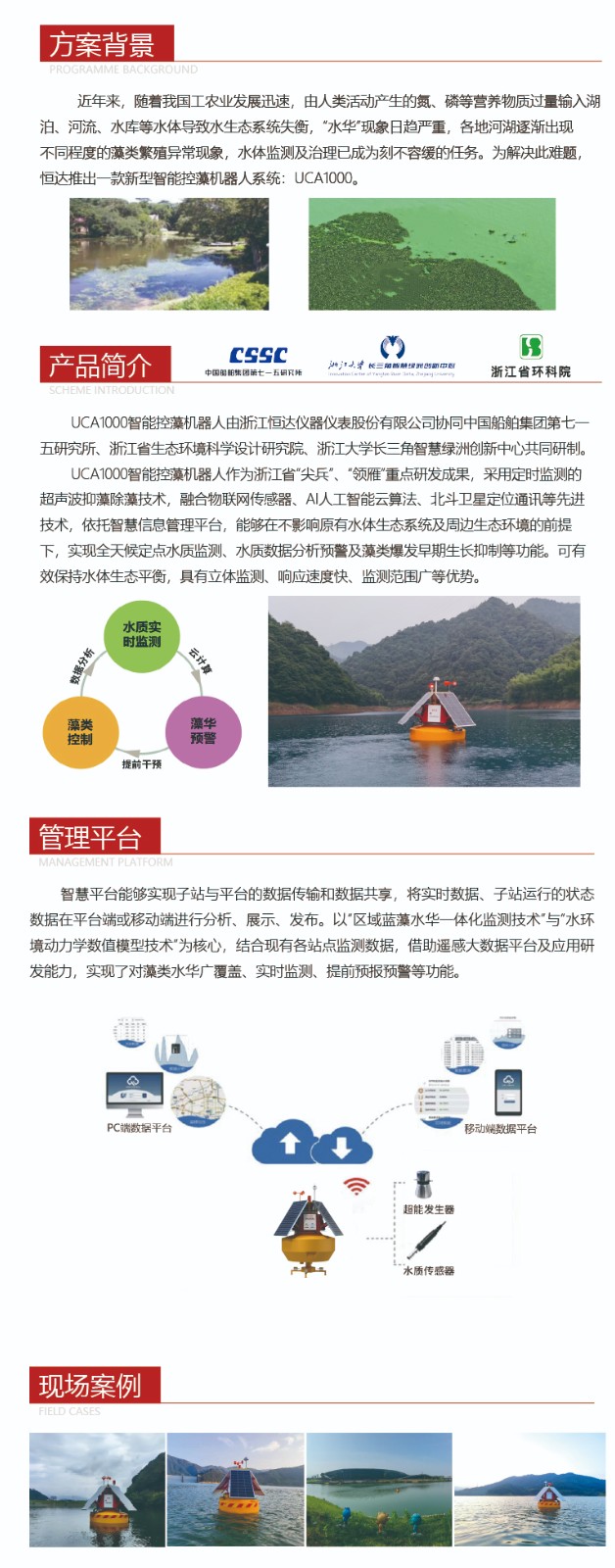 UCA1000智能控藻机器人由浙江BG视讯平台仪器仪表股份有限公司协同中国船舶集团第七一 五研究所、浙江省生态环境科学设计研究院、浙江大学长三角智慧绿洲创新中心共同研制。 UCA1000智能控藻机器人作为浙江省“尖兵”、“领雁”重点研发成果,采用定时监 测的超声波抑藻除藻技术,融合物联网传感器、AI人工智能云算法、北斗卫星定位通讯等 先进技术,依托智慧信息管理平台,能够在不影响原有水体生态系统及周边生态环境的前 提下,实现全天候定点水质监测、水质数据分析预警及藻类爆发早期生长抑制等功能。可 有效保持水体生态平衡,具有立体监测、响应速度快、监测范围广等优势。 |